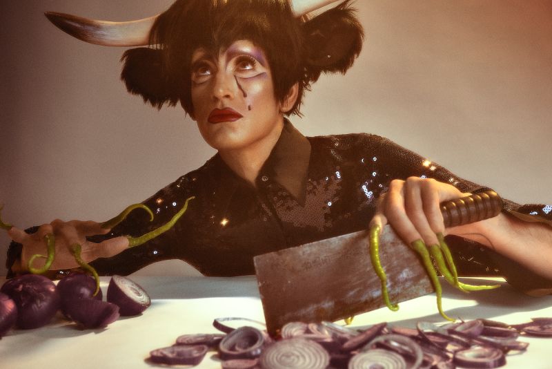 The alter-ego of artist and musician Daniel Hellmann, who lives in Berlin and Zurich, Soya blurs the boundaries between male and female, human and cow, and negotiates between a serious desire to change the world and a sense of humor and lightness. She playfully questions the relationship between humans and non-humans, asking what our lives would look like if we stopped cutting others to pieces.