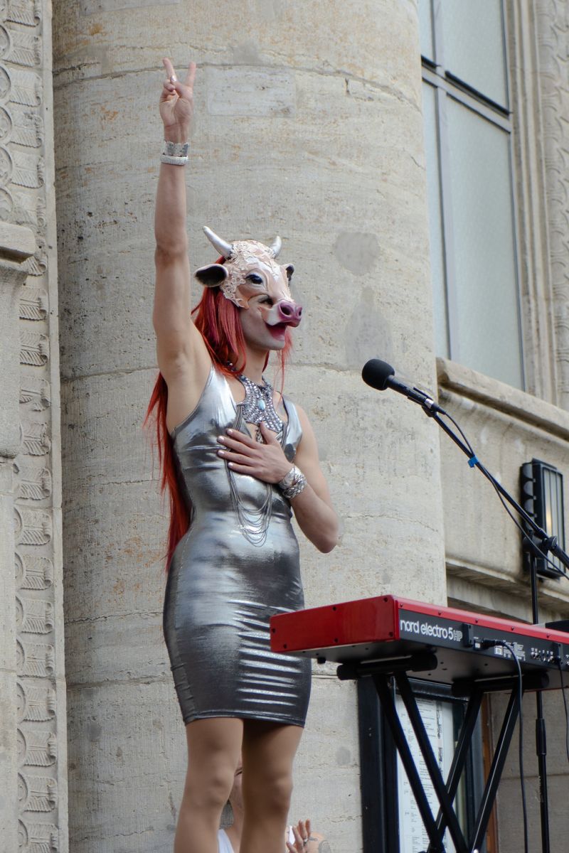 Vache drag queen sex-positive, féministe et vegan libérée du genre et de l’espèce, Soya the cow danse, chante et parle.